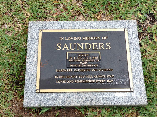 | Saunders | Vivian | photo | 2542 | 19/04/1919 | 15/08/2008 | h/o Mary, f/o Margaret, Catherine & Vivienne | ||