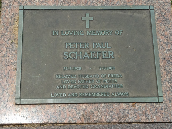 | Schaefer | Peter Paul | photo | 2340 | 27/07/1928 | 2/01/1989 | h/o Freda, f/o Peter | ||