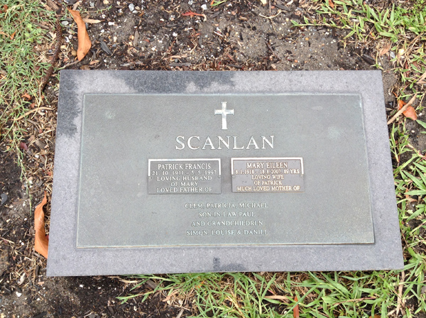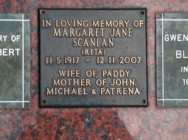 | Scanlan | Margaret Jane (Reta) | photo | 3277 | 11/05/1917 | 12/11/2007 | w/o Paddy, m/o John, Michael & Patrena | ||