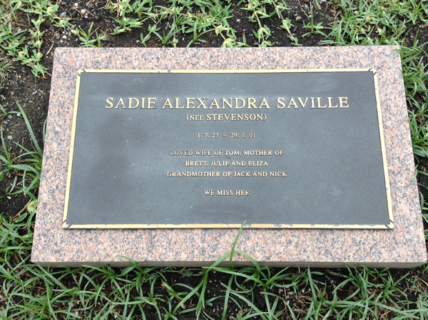 | Saville | Sadie Alexandra | photo | 3880 | 1/07/1927 | 29/01/2001 | w/o Tom, m/o Brett, Julie & Eliza, G/m of Jack & Nick | ||