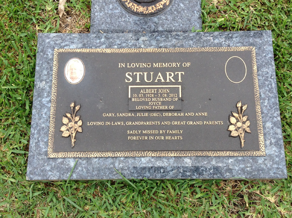 | Stuart | Albert John | photo | 3406 | 10/03/1928 | 3/08/2012 | h/o Joyce, f/o Gary, Sandra, Julie (Dec.), Deborah & Anne | ||