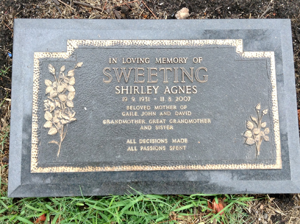 | Sweeting | Shirley Agnes | photo | 3422 | 19/09/1931 | 11/08/2007 | m/o Gaile, John & David | ||
