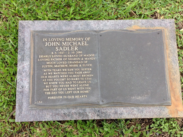 | Sadler | John Michael | photo | 3467 | 8/05/1927 | 2/10/2006 | h/o Madge, f/o Sharon & Mandy, G/f of Justin, Mathew, Mark & Elyce | ||
