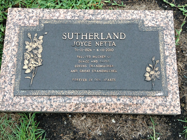 | Sutherland | Joyce Netta | photo | 4137 | 21/11/1924 | 4/11/2010 | m/o Denise & David | ||