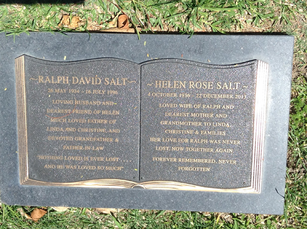 | Salt | Helen Rose | photo | 4518 | 4/10/1936 | 22/12/2013 | W/o Ralph m/o Linda & Christine | ||