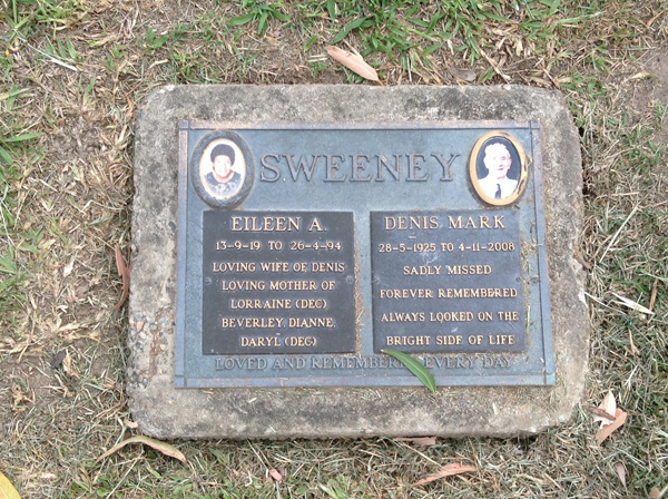 | Sweeney | Eileen A | photo | 794 | 13/09/1919 | 26/04/1994 | h/o Annie Irene | ||