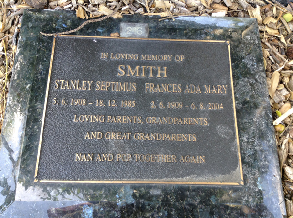 | Stonestreet | Ena Joy | photo | 1159 | 14/11/1928 | 4/09/1996 | w/o Arthur, m/o Steven, Anne, David & Rex | ||