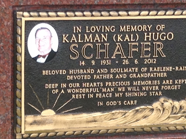 | Schafer | Kalman (Kal) Hugo | photo | 5602 | 14/09/1931 | 26/06/2012 | H/o Raelene-Rae | ||