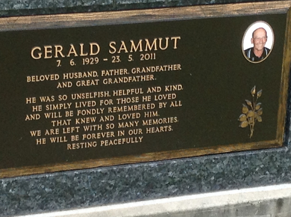 | Sammut | William | photo | 5627 | 0/0/1927 | 0/0/2016 | H/o Stella ,father & father-in-law of Lucy & Stephen, Gf/o Rachael, Bradley & Darren, GGf/o Ava | ||