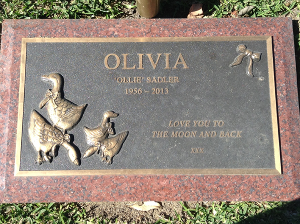| Sadler | Olivia (Ollie) | photo | 297 | 1956y | 2013y | w/o Walter, m/o Robina & William, G/m of Erika, Alexina, Christina, Jonathan, Tessa & Sarah | ||