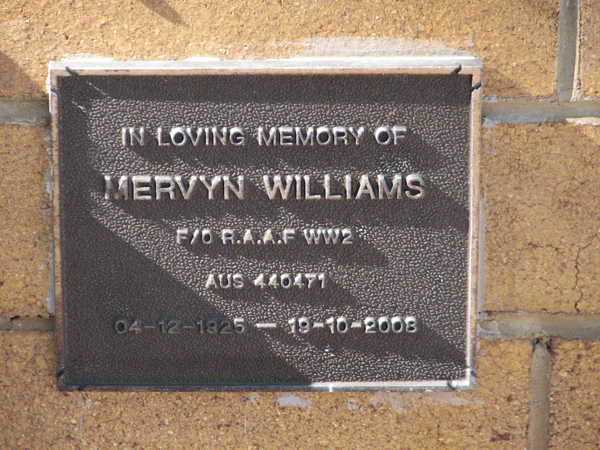 | Williams | Mervyn | photo | 4/12/1925 | 19/10/2008 | F/O RAAF WW2 AUS 440471 | ||