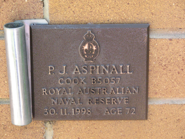 | Aspinall | P J | photo | 30/11/1998 | 72 | Cook B5057 Royal Aust Naval Reserve | ||