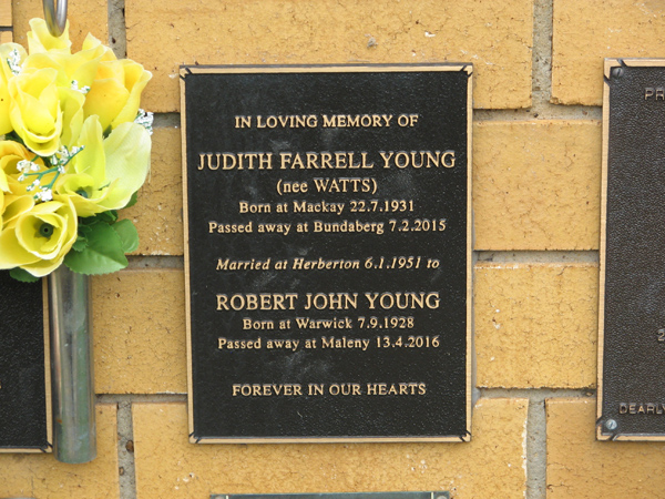 | Young | Judith Farrell | photo | 22/07/1931 | 7/02/2015 | nee Watts born Mackay married at Herberton 6/1/1951 | ||