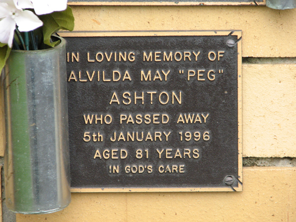 | Ashton | Alvilda May 'Peg' | photo | 5/01/1996 | 81 | |||