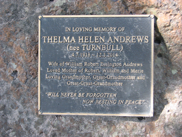 | Andrews | Thelma Helen | photo | 4/07/1918 | 12/03/2014 | nee Turnbull w/o William Robert Essington Andrews m/o Robert, William & Merie | ||