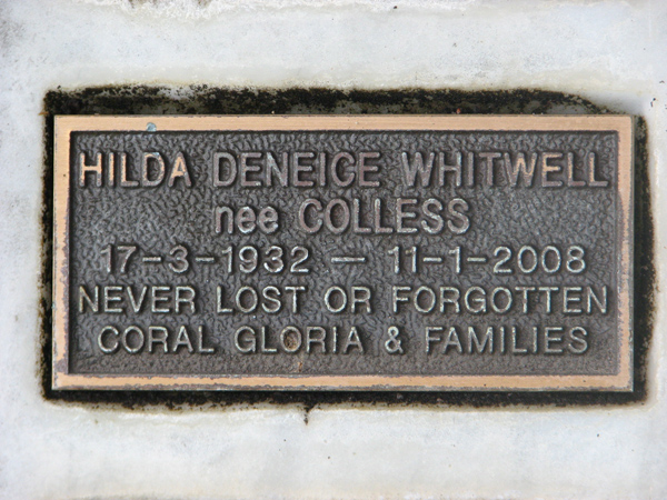 | Whitwell | Hilda Deneice | photo | 17/03/1932 | 11/01/2008 | nee Colless, never lost or fogotten Coral, Gloria | ||