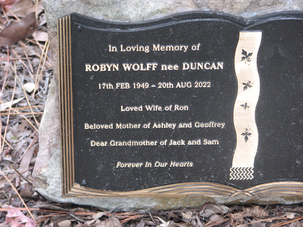 | Wolff | Robyn | photo | 17/02/1949 | 20/08/2022 | nee Duncan w/o Rob m/o Ashley & Geoffrey gm/o Jack & Sam | ||