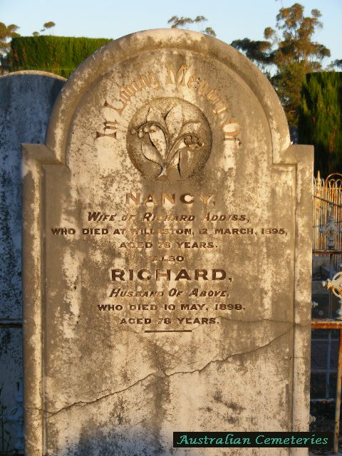 | ADDIS | Anne | photo | ??.??.1855 | 10 | Headstone moved from Gawler Pioneer Park | |