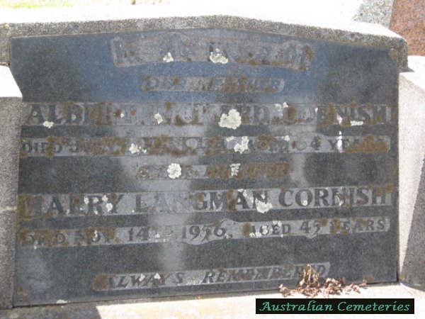 | CORNISH | Harry Langman | photo | 14/11/1956 | 45 | par Albert R & Mary Louisa,buried with father Albert R | ||||
