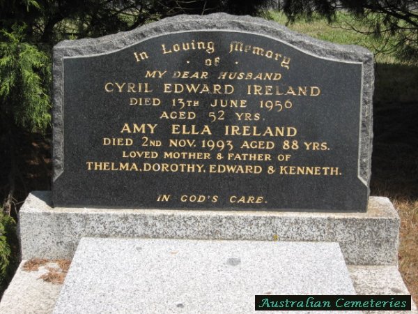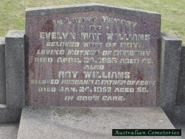 | WILLIAMS | Evelyn May | photo | 24/4/1956 | 47 | Roy | buried next to par Robert A & Isabella Doy,mother to Dorothy. | |||