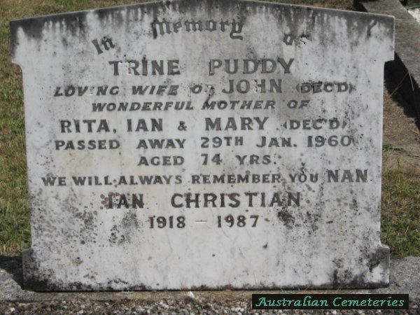 | PUDDY | Trine | photo | 29/1/1960 | 74 | John | nee Christensen,mother to Rita,Ian & Enid Mary (dec) | |||