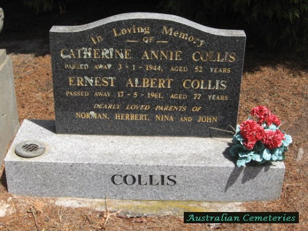 | COLLIS | Ernest Albert | photo | 17/5/1961 | 77 | Catherine A | father to Norman,Herbert,Nina & John | |||