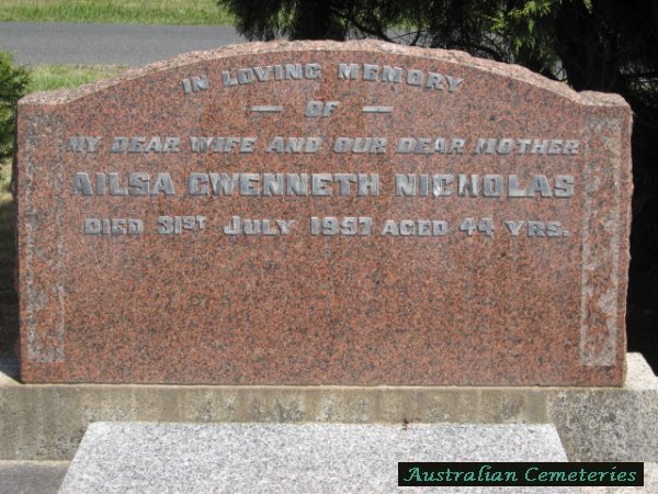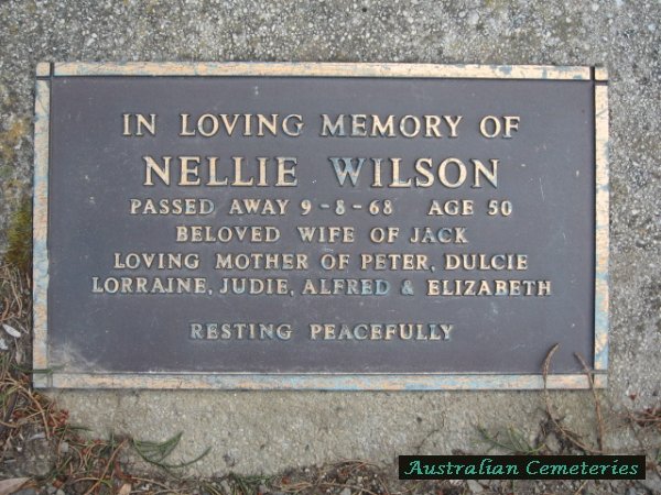 | WILSON | Nellie | photo | photo | 9/8/1968 | 50 | Jack J | m/o Peter,Dulcie,Lorraine,Judie,Alfred & Elizabeth | ||
