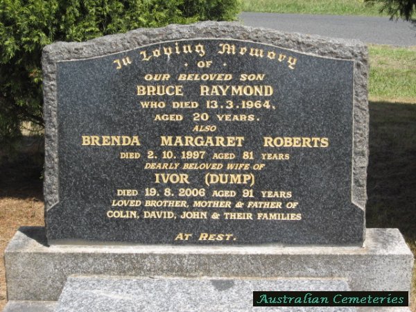 | ROBERTS | Bruce Raymond | photo | 13/3/1964 | 20 | buried with par Brenda M & Ivor,bro to Colin,David & John | ||||