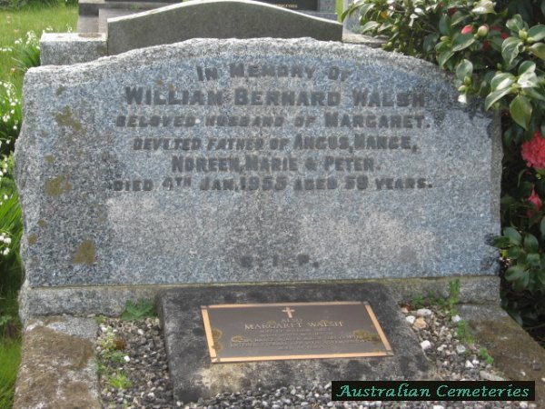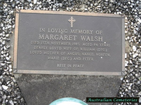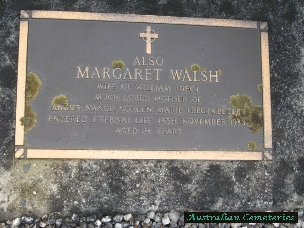 | WALSH | Margaret | photo | photo | photo | 13/11/1985 | 84 | William B | m/o Agus,Nance,Noreen,Marie (dec) & Peter | |