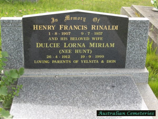 | RINALDI | Dulcie Lorna Miriam | photo | 26/4/1912 | 19/9/1999 | Henry F | m/o Yelnita & Dion | |||