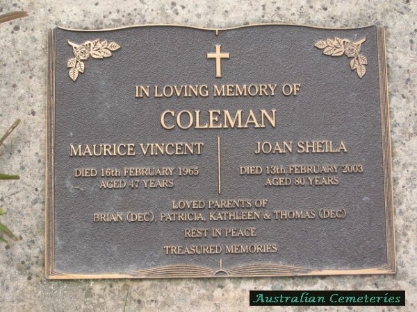 | COLEMAN | Maurice Vincent | photo | 16/2/1965 | 47 | Joan S | f/o Brian (dec),Patricia,Kathleen & Thomas (dec),par John & Elizabeth | |||