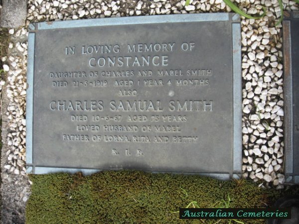 | SMITH | Charles Samuel | photo | photo | 10/5/1957 | 75 | Mabel C | f/o Lorna,Rita & Betty. | ||