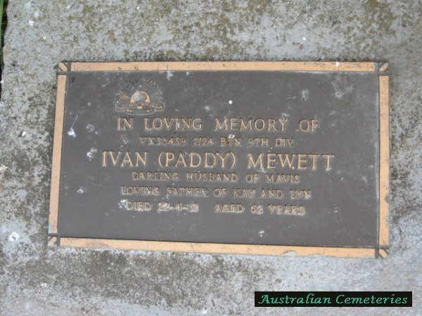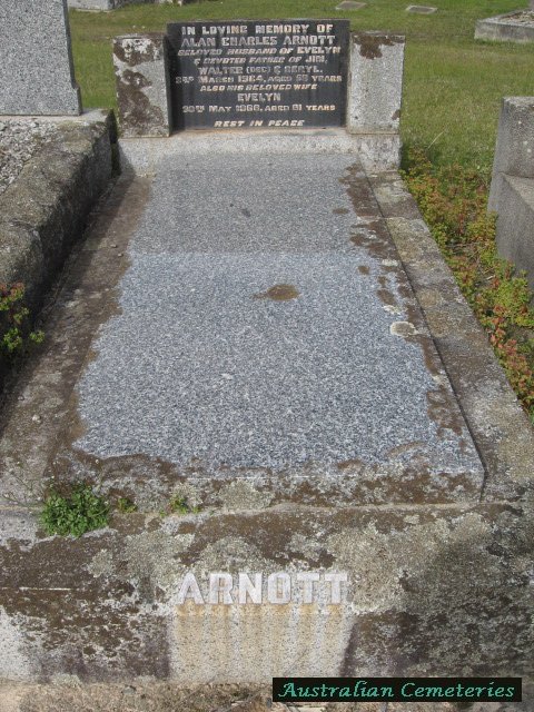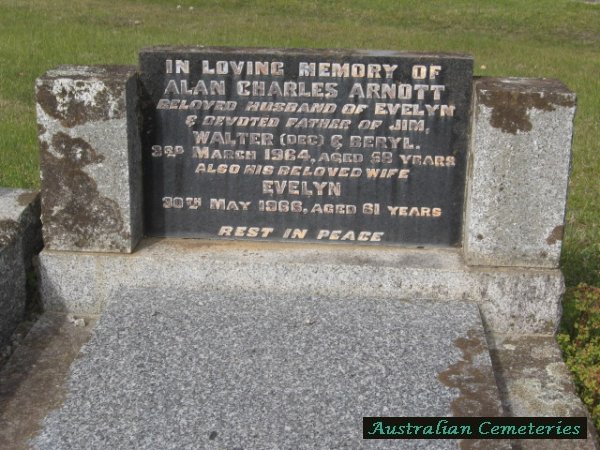 | ARNOTT | Alan Charles | photo | photo | 3/3/1964 | 58 | Evelyn | par Albert J & Sarah Anne,f/o Jim,Walter (dec) & Beryl. | ||