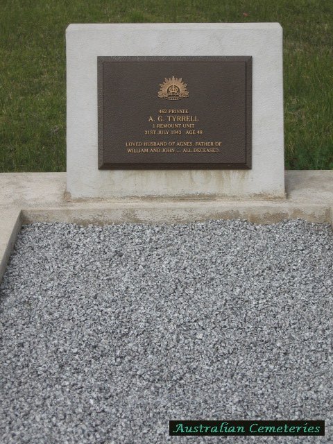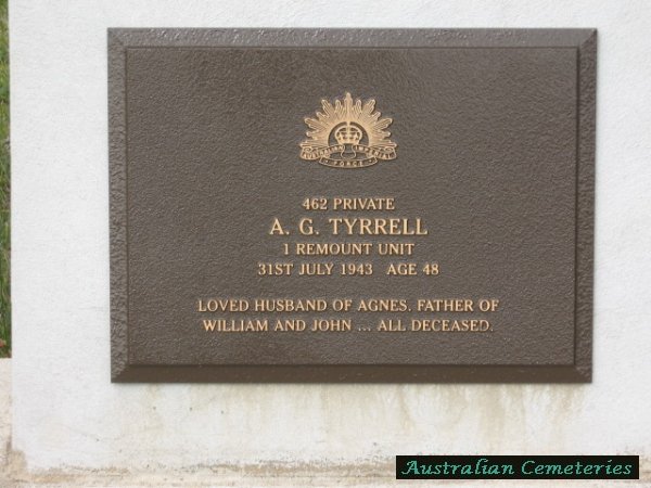 | TYRRELL | A.G.(Arthur George ) | photo | photo | 31/7/1943 | 48 | Agnes | Army 462 private,f/o William & John all dec,par William A & Annie Isabella. | ||