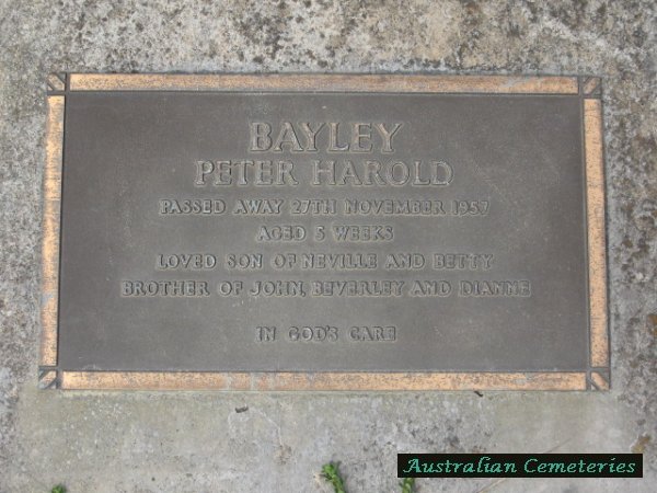 | BAYLEY | Peter Harold | photo | 27/11/1957 | 5w | par Neville & Betty,bro to John,Beverley & Dianne. | ||||