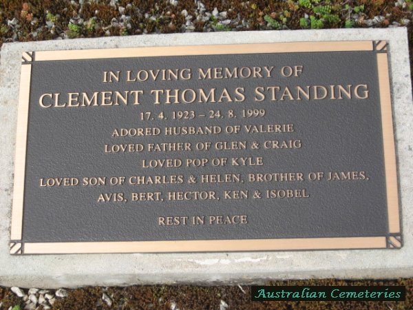 | STANDING | Clements Thomas | photo | photo | 17/4/1923 | 24/8/1999 | Valerie | f/o Glen & Graig,par Charles & Helen,bro to James,Avis,Bert,Hector,Ken & Isobel. | ||