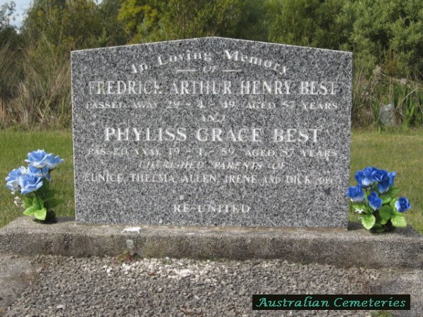 | BEST | Frederick Arthur Henry | photo | 29/4/1949 | 57 | Phyliss G | par John & Sarah Ann.f/o Eunice,Thelma,Allan,Irene & Dick (dec) | |||