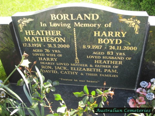 | BORLAND | Heather Matheson | photo | 17/3/1924 | 31/3/2000 | 76 | Harry B | m/o Ron,Jack,Elizabeth,Pam,David,Cathy | ||