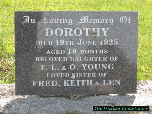 | YOUNG | Dorothy | photo | 19/6/1925 | 10m | par T.L. & O.Young,sis to Fred,Keith & Len | ||||