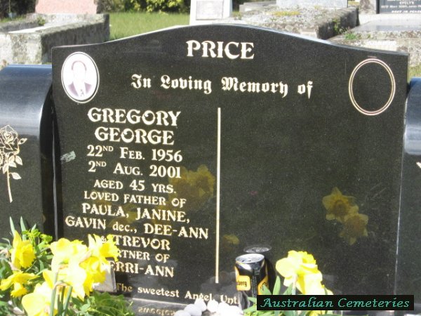| PRICE | Gregory George | photo | 22/2/1956 | 2/8/2001 | 45 | f/o Paula,Janine,Gavin (dec),Dee-Ann Trevor,Partner to Kerri-Ann | |||