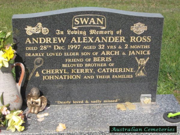 | SWAN | Andrew Alexander Ross | photo | 28/12/1997 | 32 | par Arch & Janice,bro to Cheryl,Kerry,Catherine & Johnathon. | ||||