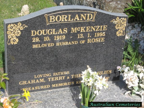 | BORLAND | Douglas McKenzie | photo | 29/10/1919 | 13/1/1995 | Rosie | f/o Graham & Terry | |||