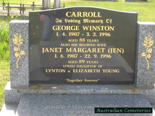 | CARROLL | Janet Margaret (Jen) | photo | 1/6/1907 | 22/9/1996 | 89 | George W | par Lynton & Elizabeth Young | ||