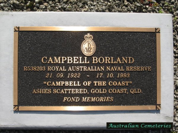| BORLAND | Campbell | photo | photo | 21/9/1922 | 17/10/1993 | RANR R538203,Ashes Scattered Gold Coast Qld | |||