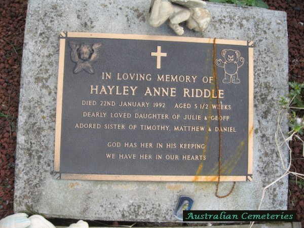 | RIDDLE | Hayley Anne | photo | 22/1/1992 | 5w | par Julie & Geoff,sis to Timothy,Matthew & Daniel | ||||