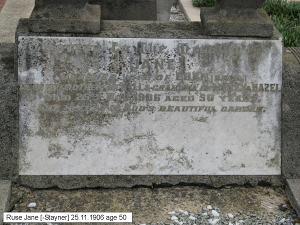 | photo | Ruse | Jane [-Stayner] | 25.11.1906 | 50 yrs. | ||
