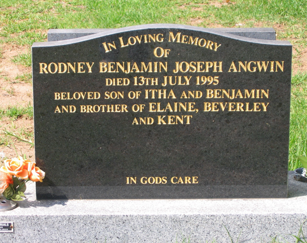 | ANGWIN | Rodney Benjamin Joseph | photo | 13/7/1995 | buried next to par Itha & Benjamin ,bro to Elaine,Beverley & kent | ||||