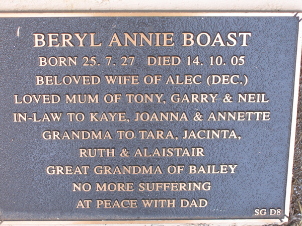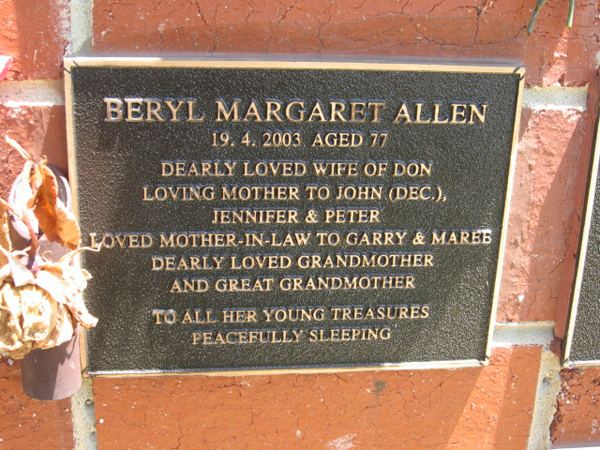 | ALLAN | Beryl Margaret | photo | 19/4/2003 | 77 | Donald E. | m/o John (dec) Jennifer & peter | ||