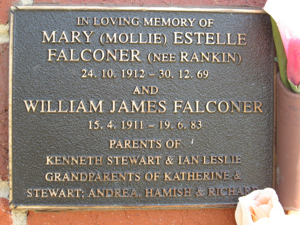 | FALCONER | Mary Estelle | photo | 24/10/1912 | 30/12/1969 | William J. | nee Fankin.,m/o Kenneth Stewart &Ian Leslie | ||