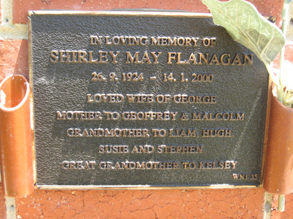 | FLANAGAN | Shirley May | photo | 26/9/1924 | 14/1/2000 | George T | m/o Geoffrey & Malcolm | ||